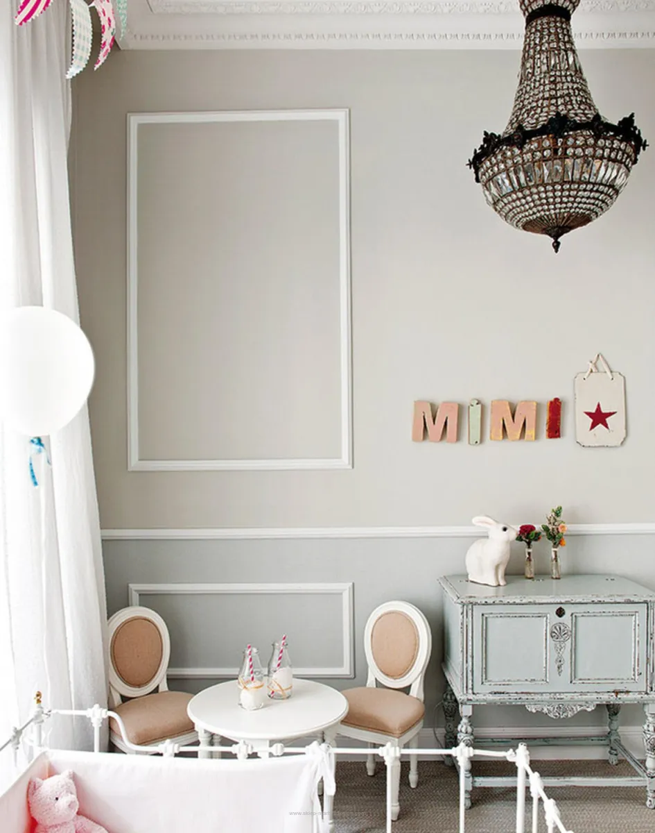 Tradycyjna biała sztukateria to podstawa, ale w pokoju dziecięcym warto postawić na kolor i wyobraźnię. Listwy można pomalować na pastelowe odcienie różu, błękitu, mięty czy lawendy, tworząc delikatne, uspokajające tło dla dziecięcej przestrzeni. Takie rozwiązanie sprawdzi się szczególnie w pokojach niemowląt, gdzie dominuje filozofia montessori i stonowane kolory.