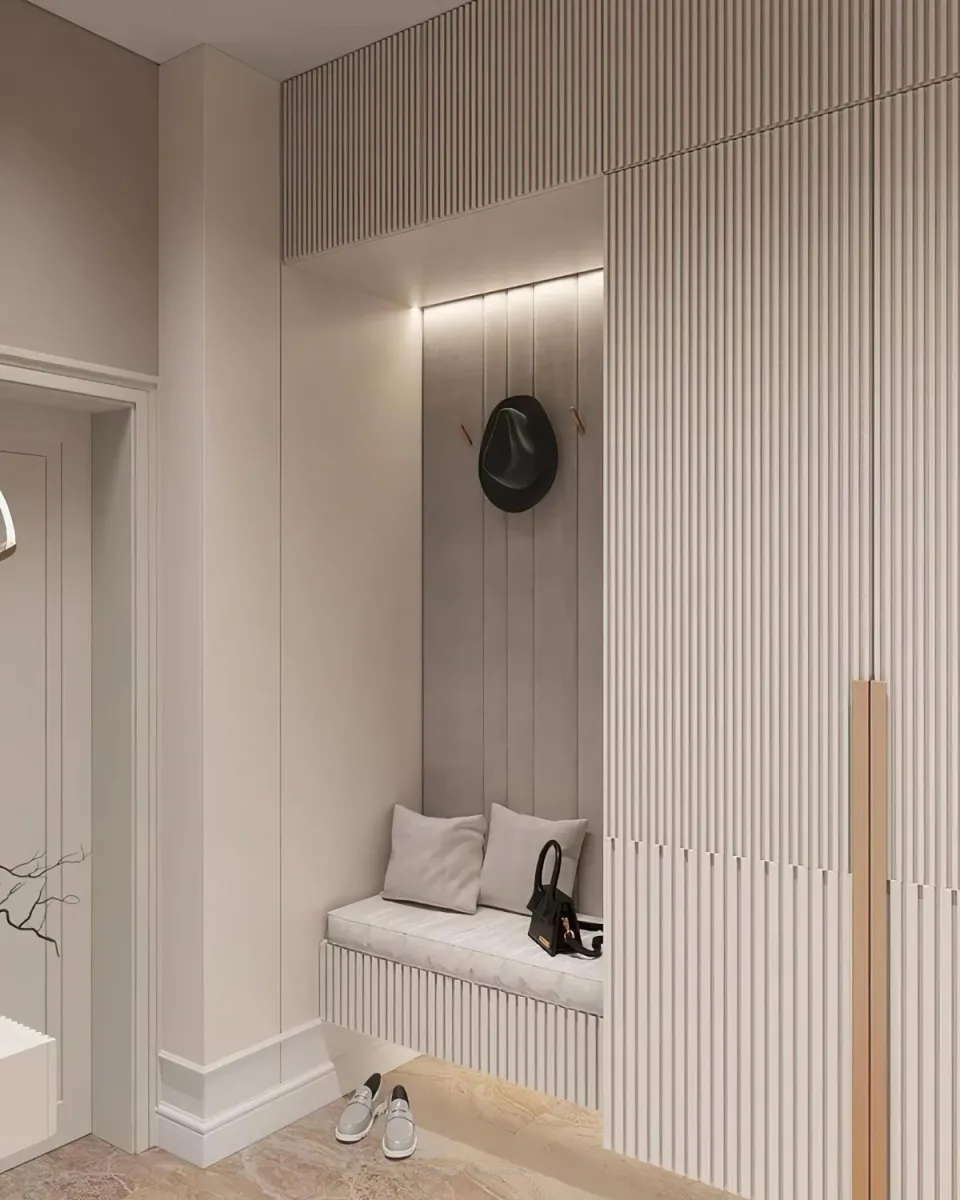 - Nisza na szafę - jeśli w korytarzu znajduje się wnęka, lamele mogą ją wyeksponować lub wizualnie zatrzeć